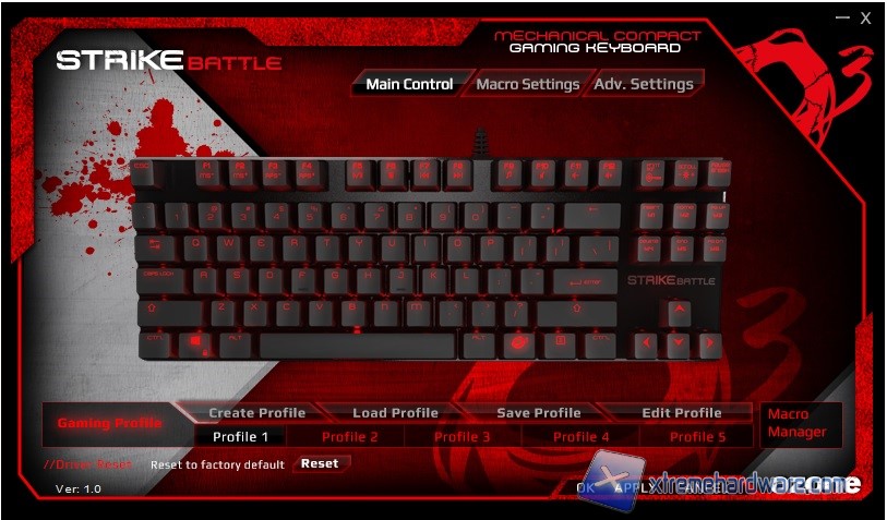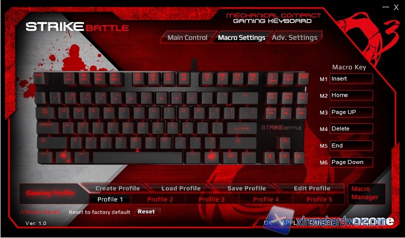 Il primo è “Main Control”: troviamo l’immagine della tastiera e sotto i profili che potremo creare con le varie impostazioni o i vari tasti che assegneremo. Come detto prima ,la tastiera è dotata di 64KB di memoria on-board che ci permette di salvare in 5 profili fino a 30 macro ed altre impostazioni. Da questo menù, come si può vedere, avremo pieno controllo dei profili. Potremo crearli, caricarli, salvarli o editarli. Potremo anche resettare le modifiche e ripristinare i valori di default della tastiera in caso di problemi.