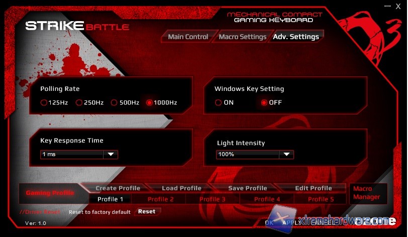 Infine troviamo il Menù “Advanced Settings” che ci permetterà di regolare da software il polling rate, il tempo di risposta, la retroilluminazione o la modalità G. Tutte opzioni che possiamo eseguire direttamente sulla tastiera tramite il tasto funzione. Quindi se non avete bisogno di Macro o altre funzioni potrete anche non installare il programma e usufruire delle funzioni “manuali” della tastiera. Ovviamente precisiamo che la tastiera è dotata di memoria on-board quindi al limite potrete creare ed assegnare le Macro precedentemente e subito dopo disinstallare il software. Rimarranno comunque salvate.