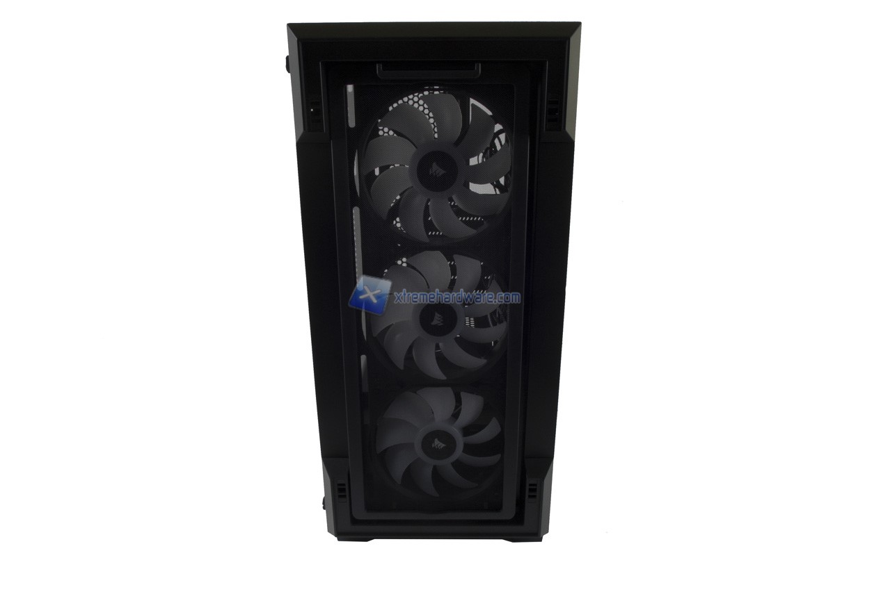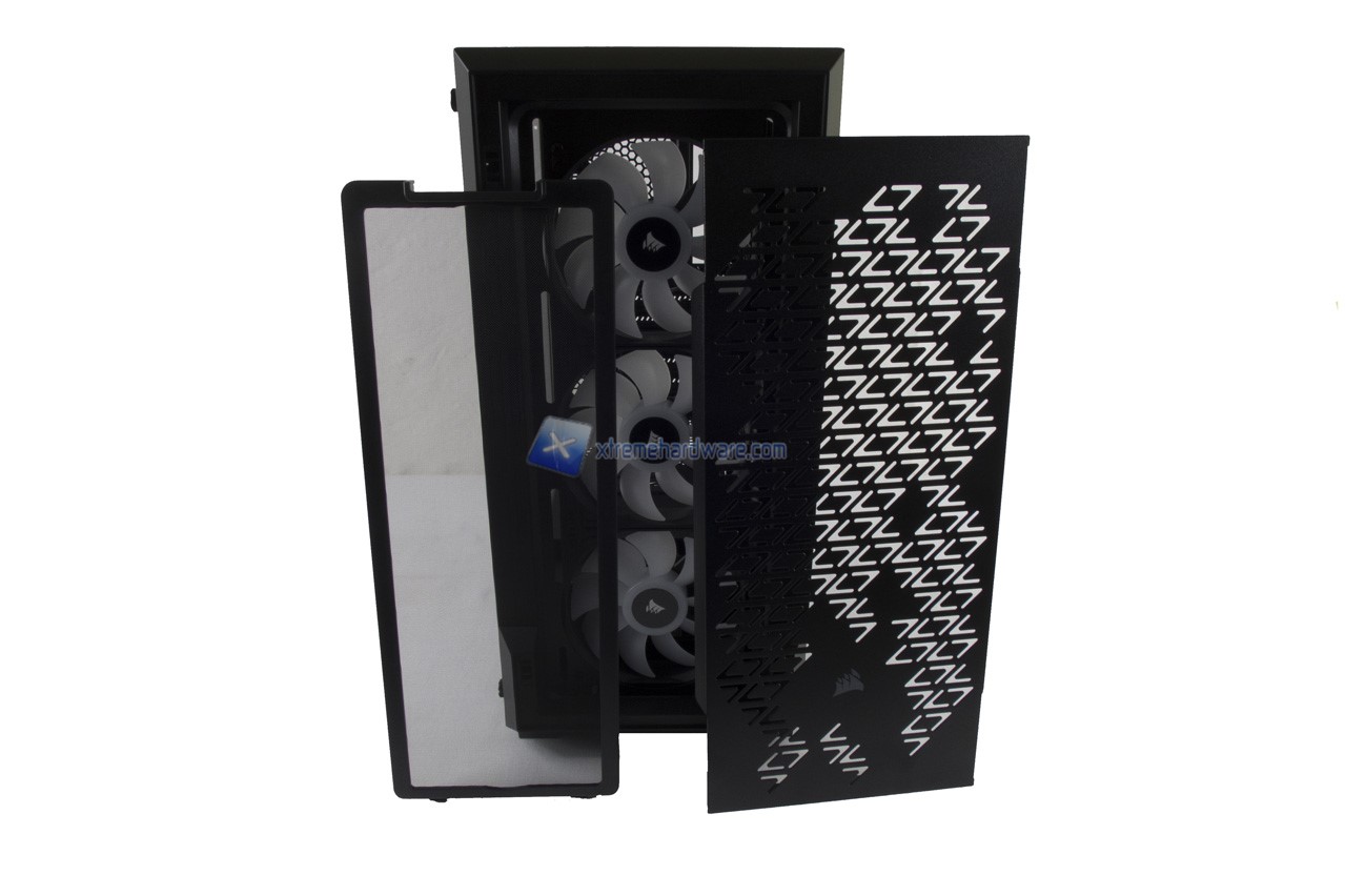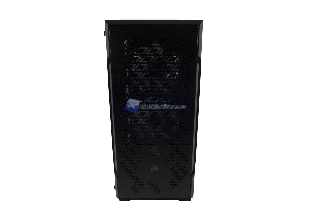 Dando uno sguardo più da vicino al frontale possiamo osservare una doppia struttura. Il plate centrale è in solido acciaio con fori dal disegno geometrico. Esso è anche facilmente removibile per accedere al filtro antipolvere posto subito dietro. Il contorno di questo plate è una struttura in plastica che rimossa ci darà modo di accedere alle tre ventole da 120 mm Corsair SP120 RGB Pro preinstallate. Queste potranno essere rimosse per eventualmente installare solo 2x 140 mm.