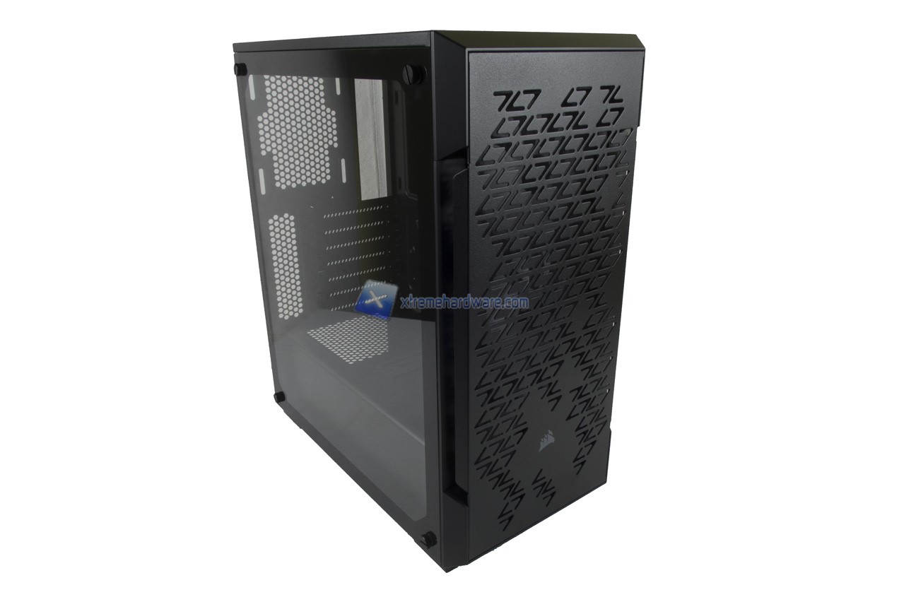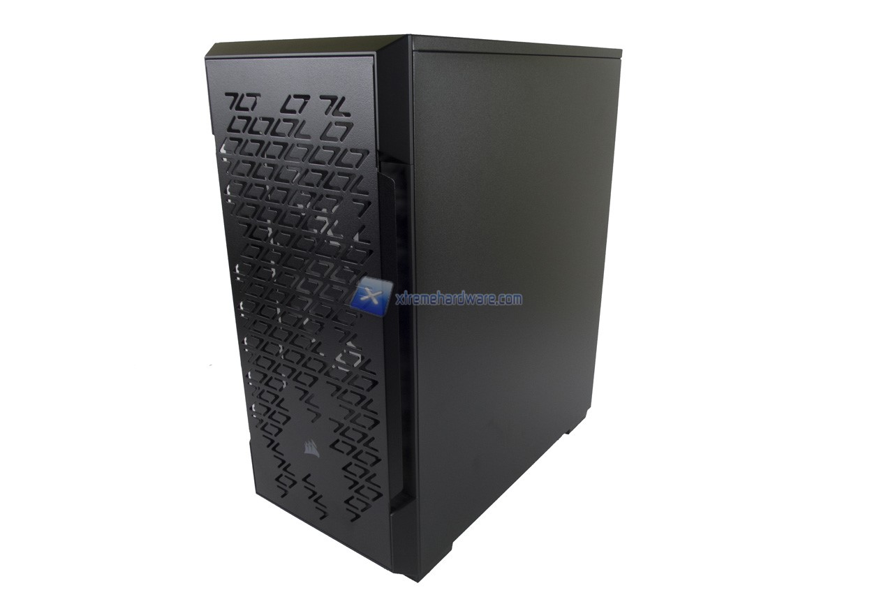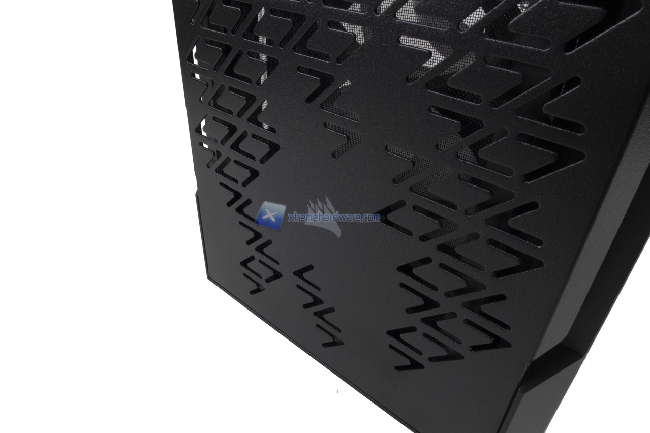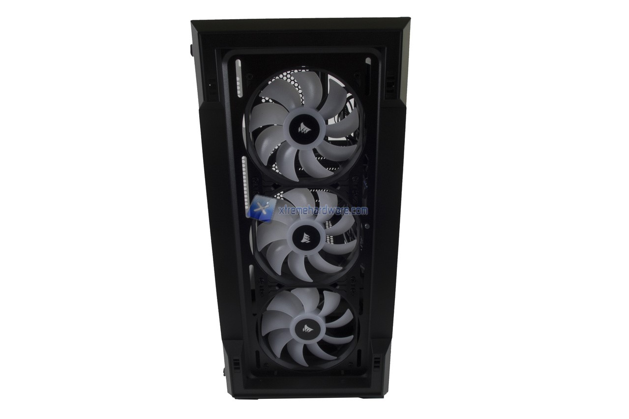 Dando uno sguardo più da vicino al frontale possiamo osservare una doppia struttura. Il plate centrale è in solido acciaio con fori dal disegno geometrico. Esso è anche facilmente removibile per accedere al filtro antipolvere posto subito dietro. Il contorno di questo plate è una struttura in plastica che rimossa ci darà modo di accedere alle tre ventole da 120 mm Corsair SP120 RGB Pro preinstallate. Queste potranno essere rimosse per eventualmente installare solo 2x 140 mm.