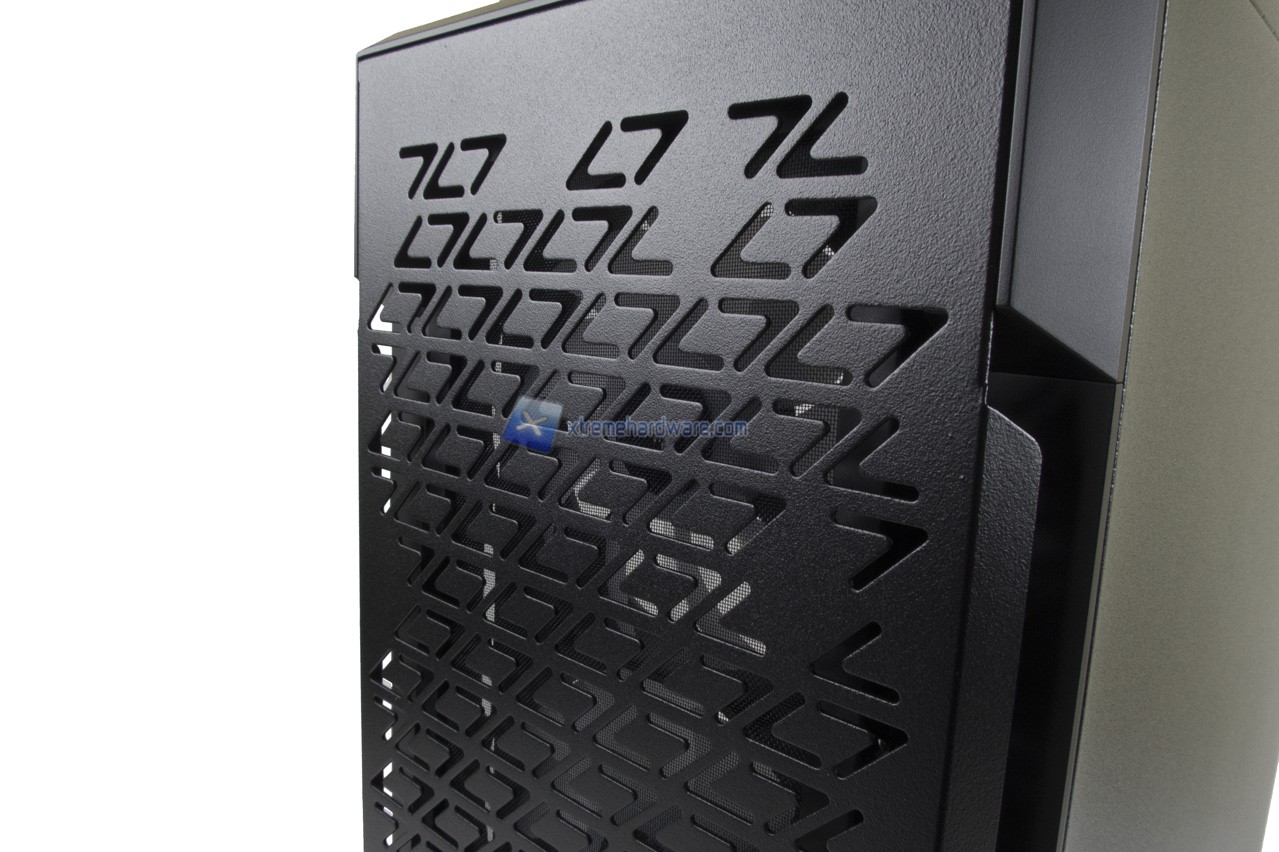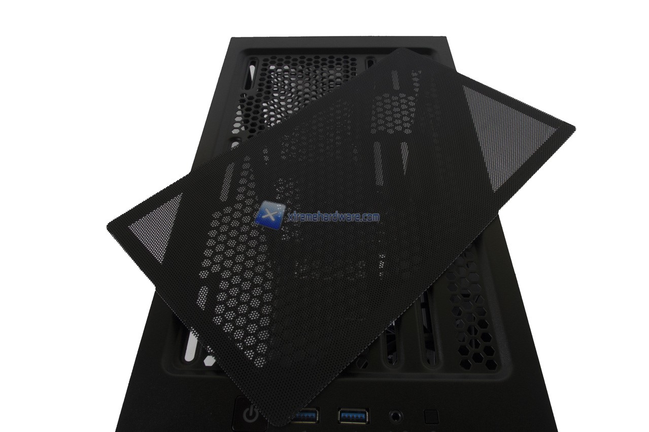 Il pannello superiore presenta una griglia che ci permetterà di installare solo ventole in configurazione 2x 120 mm o 2x 140 mm. Non manca anche il filtro antipolvere magnetico di facile rimozione e pulizia.