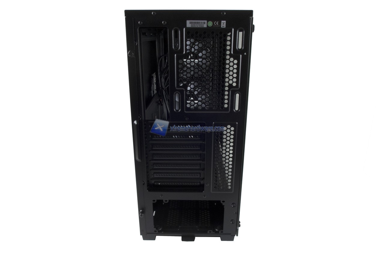 Arriviamo al lato posteriore. Solito layout e disposizione. Foro per I/O Shield con a lato griglia per installare un ulteriore ventola da 120 mm. 7 slot PCI-E e infine il foro per l’alimentatore.