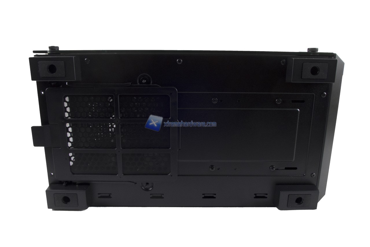 Capovolgiamo il case e passiamo a dare uno sguardo al lato inferiore. Presenti quattro piedini in plastica con inserto gommato. A sinitra è presente un filtro antipolvere in corrispondenza della ventola dell’alimentatore. Filtro sfilabile per essere pulito. A destra sono presenti quattro viti che insieme ad un quinta interna permetteranno di rimuovere il cage per Hard Disk meccanici da 3,5’’.